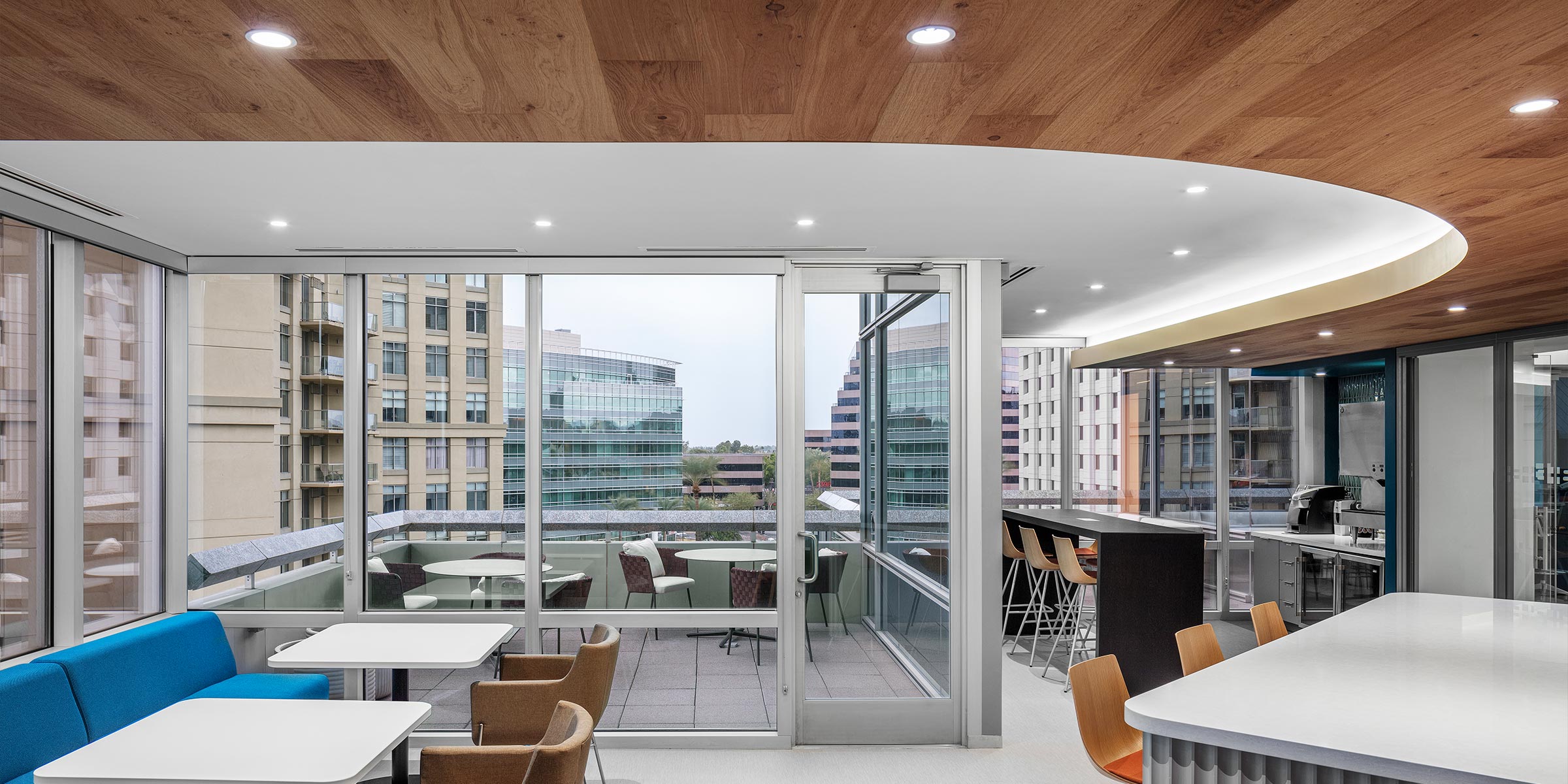 Inspired by the vibrant desert landscape of Phoenix, Arizona, NELSON’s design team envisioned a space that incorporates abstract organic forms and colors with layers of contrasting textures. Rich warm metals, glowing accent lighting, and soft patterns were used in the design to create vignettes of focal points that complement the outdoor views. Stepping inside the main boardroom, one can observe the subtle ‘Chevron’ pattern of Acoufelt’s acoustic Fracture Panels in color ‘Iris’. The color and texture of the panels provide a cool contrast against the warm finishes and rugged, desert outlook, as well as serve the functional purpose of absorbing excess sound created in the space.