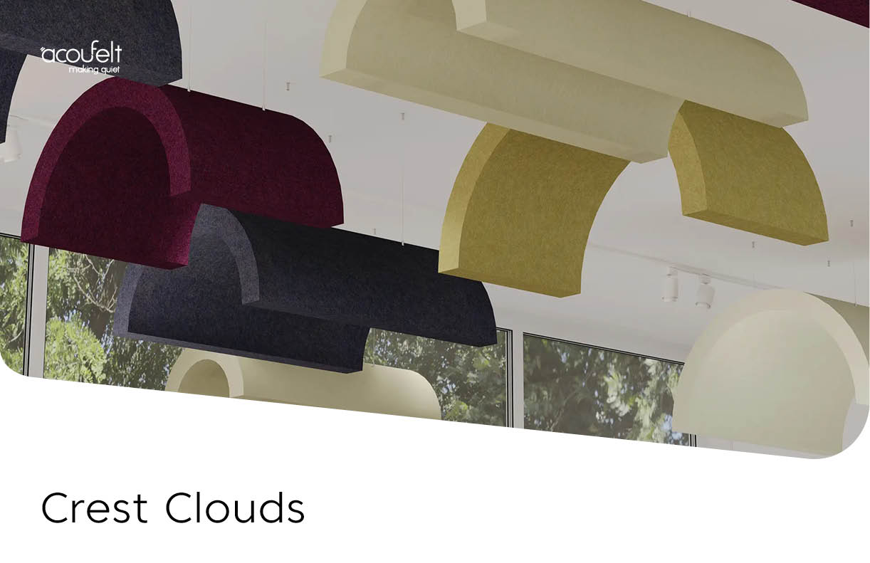 With beautifully shaped, sound-absorbing felt, Crest ceiling clouds allow you to design an interesting ceiling scape while dampening distracting noise from busy spaces.